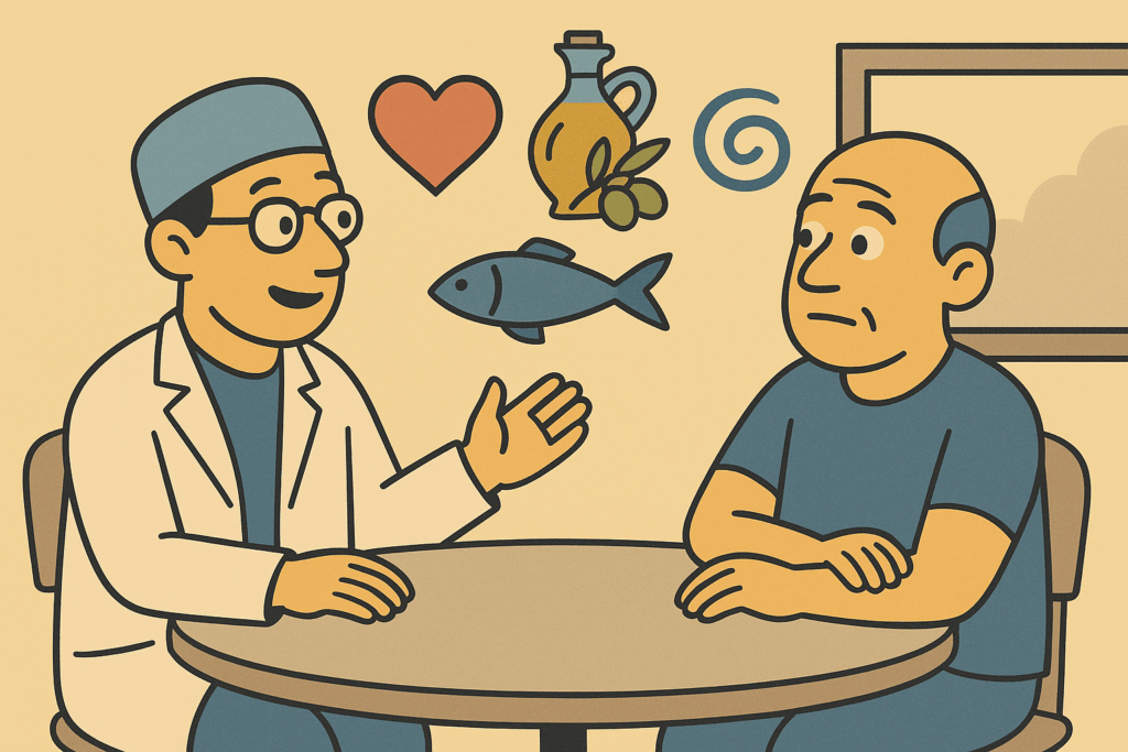 We discussed insulin, metabolism, and carbohydrate load. He decided to try a low-carb approach: eggs, fish, vegetables, olive oil. No extremes, just subtraction of sugar, starch, and stop counting calories.