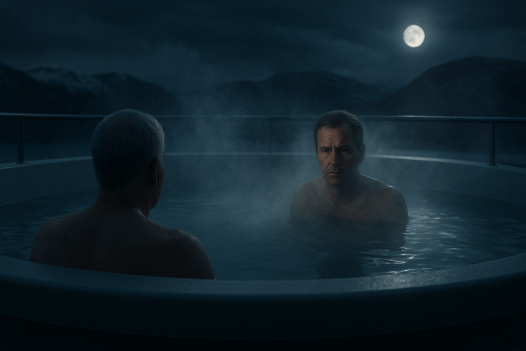 He stepped into the hot tub quietly, shoulders held a little too firmly. No sigh, no settling back — just a controlled descent.